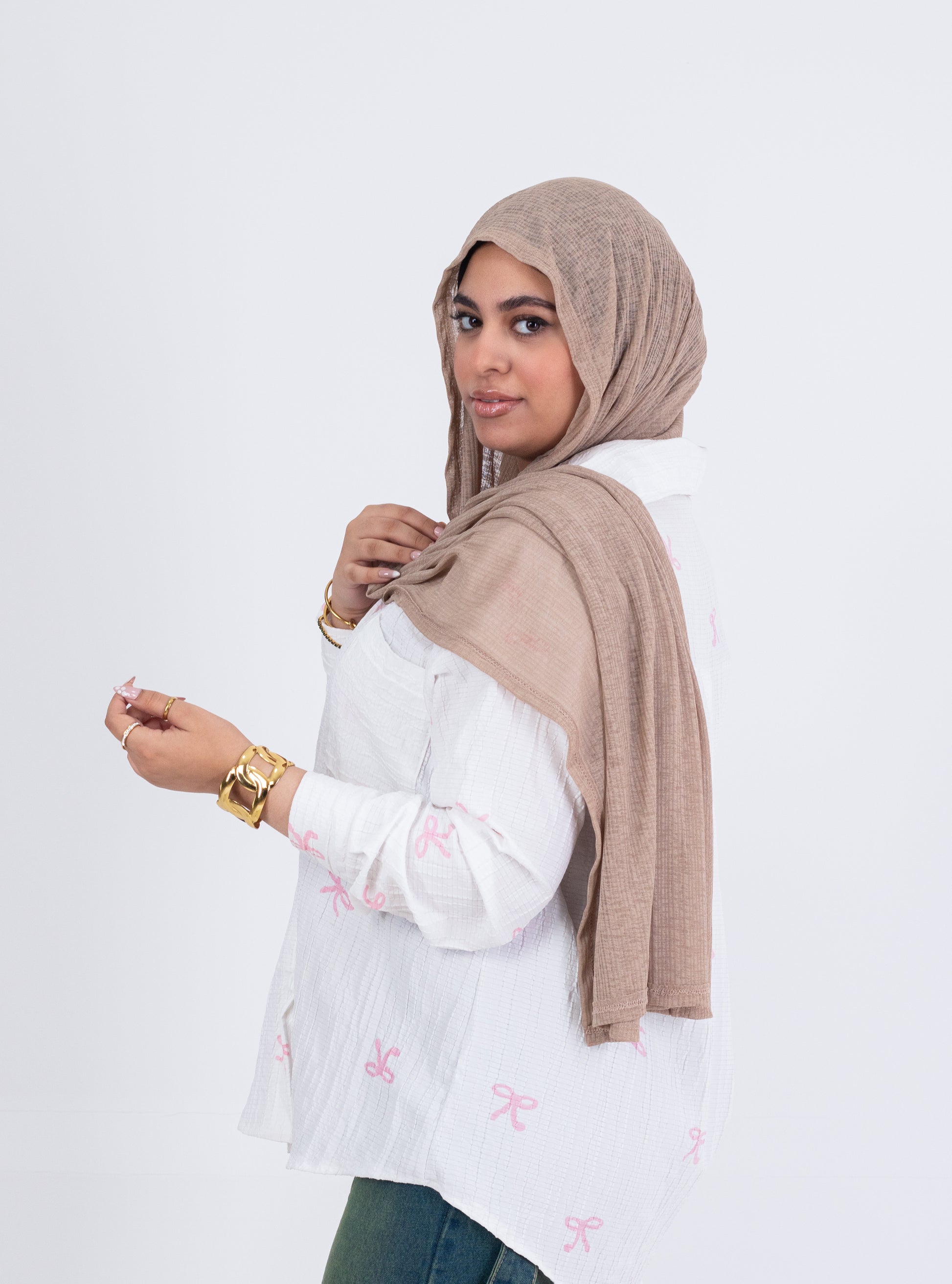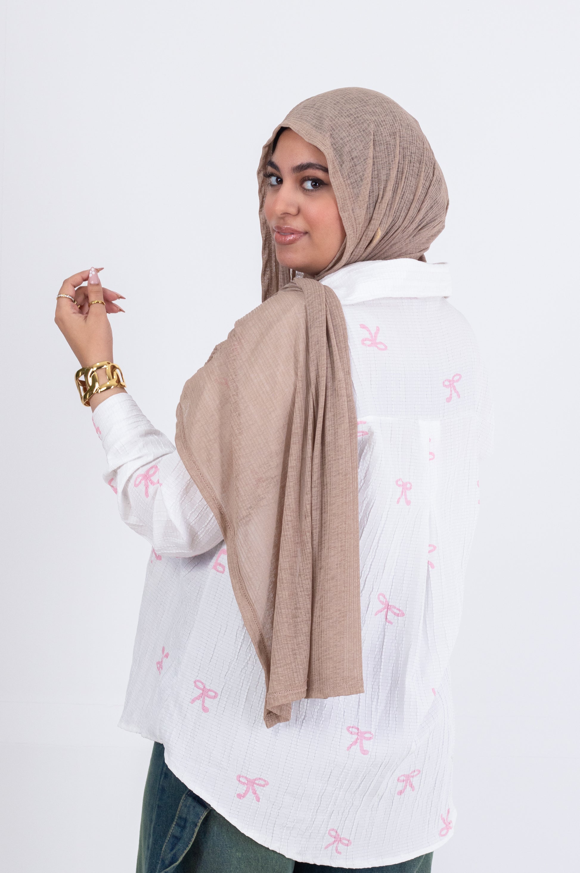 ✨ ألوان مميزة: أبيض مع طبعات فيونكات (لبني – بني – أخضر – أسود)، متوفر أيضًا بنقشة قلوب رقيقة.