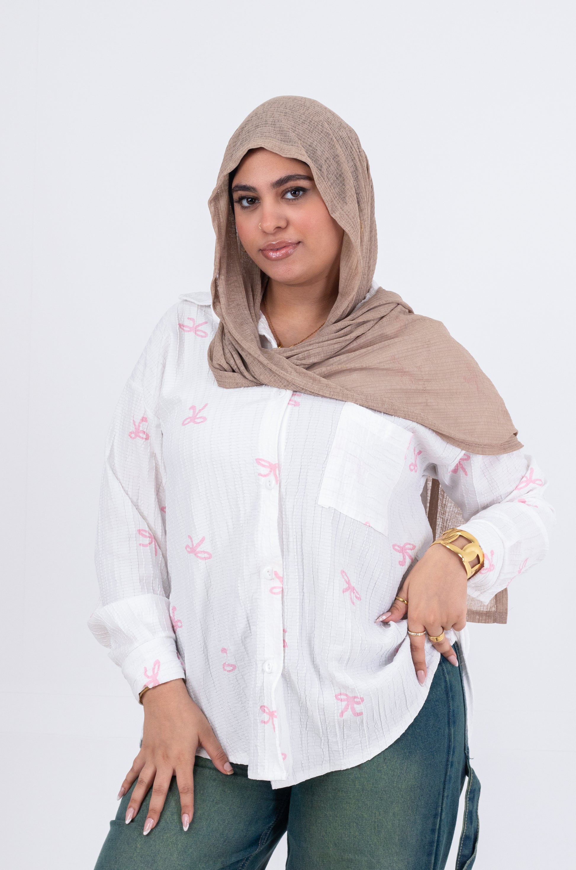 أضيفي لمسة أنوثة وجاذبية لإطلالتك مع شميز مطبوع فيونكات من خامة الفريسكا الناعمة والمريحة.